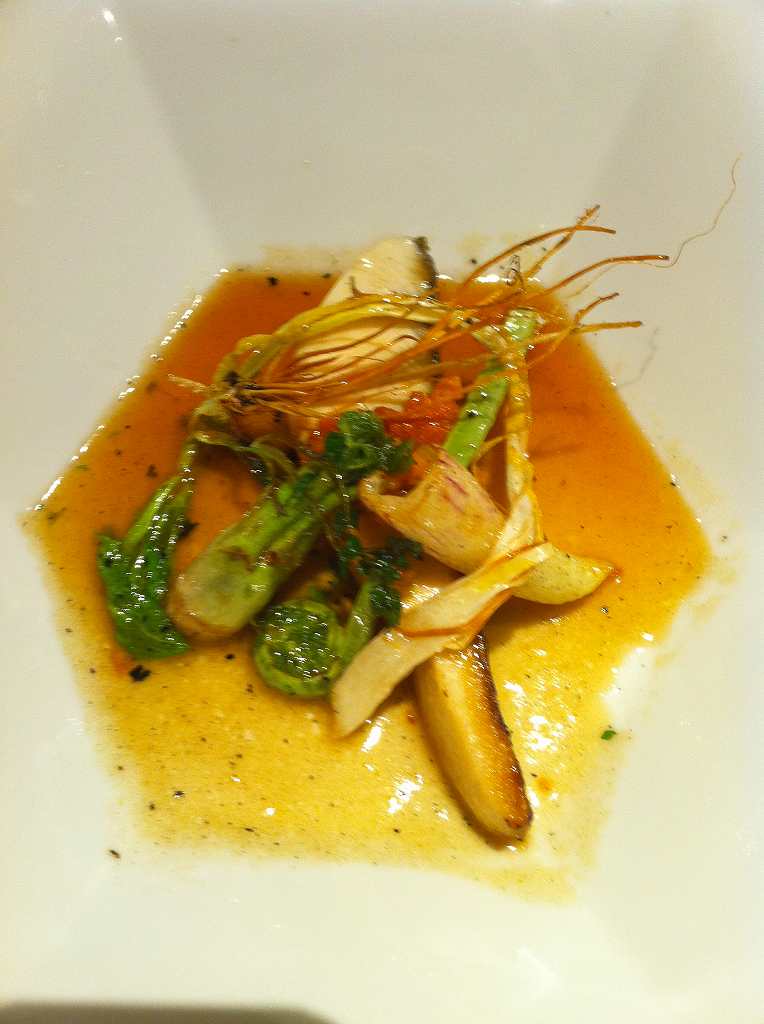 写真は 鰆に春の野菜と生うにが添えられた料理です。